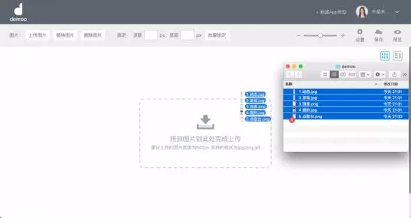 在設(shè)計(jì)工具中,我已經(jīng)設(shè)計(jì)好了全民K歌5個(gè)主要頁(yè)面的圖并命名好保存在文件夾中,準(zhǔn)備開(kāi)始制作原型。如圖所示,Demoo支持批量導(dǎo)入圖片,將我需要的圖片全部選中,拖放到虛框內(nèi),即可完成圖片導(dǎo)入工作。導(dǎo)入后,就相當(dāng)于你已經(jīng)把a(bǔ)pp原材料都放到工作臺(tái)啦,之后操作起來(lái)就會(huì)特別方便。