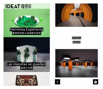 IDEAT理想家App,繼承了法國(guó)IDEAT雜志的理念,以展示設(shè)計(jì)、藝術(shù)和風(fēng)尚的「當(dāng)代生活」內(nèi)容為主。App界面上除了內(nèi)容圖片之外,幾乎沒有黑白以外的其他色彩元素。通過(guò)襯以黑底的高亮白字,既是內(nèi)容又是裝飾,貫穿在整個(gè)App設(shè)計(jì)元素當(dāng)中;調(diào)節(jié)這些文字與其他內(nèi)容之間的間距,又在排版上起到作為點(diǎn),作為線,甚至作為面的不同功用。