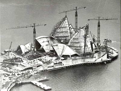 , 在最后找到一個經(jīng)濟上可以接受的解決辦法之前,設(shè)計隊伍反復嘗試了12種不同的建造“殼”的方法(包括拋物線結(jié)構(gòu),圓形肋骨和橢圓體)。后來團隊中的某個 人建議將所有球形房頂,在同一個巨大的同心圓上切割出來。該辦法可以使用一個共同的模具澆注出不同長度的圓拱,然后將若干有著相似長度的圓拱段放在一起形 成一個球形的剖面。究竟誰是這個解決辦法的發(fā)明者至今都是爭論的話題。 深化設(shè)計后的歌劇院變成了一個暖壺,內(nèi)外被分成了壺膽和壺罩的關(guān)系,這是建筑史上思想的一次突破,從此有一種建筑它的立面和內(nèi)部空間可以毫無關(guān)系了,所謂表現(xiàn)主義建筑就在這個蛋殼下誕生了。 當然制作這個“殼”是要付出代價的,悉尼歌劇院的“殼”由著名的建筑商Hornibrook Group Pty Ltd負責建造,Hornibrook在工廠中制成了2400件預制肋骨和4000件屋頂面板,加快了工程的進度。這個解決辦法的成就在于利用預制混凝土 構(gòu)建從而避免了建造昂貴的模具(他同樣允許讓屋頂面板在地上就大片的預先建造組合好,而不是在高處一個一個的拼接上)。Ove Arup和合作方的工地工程師驚訝于這些“殼”在完工前使用了創(chuàng)新的調(diào)節(jié)型彎曲鋼鐵桁構(gòu)梁來支撐不同的屋頂。 第三個大麻煩幾乎使工程被擱置了,悉尼歌劇院的屋頂是由2194塊每塊重15.3噸的彎曲形混凝土預制件,怎樣的力學結(jié)構(gòu)才能讓這些水泥砣安全地架在上 面,這是所有結(jié)構(gòu)工程師不曾遇到的挑戰(zhàn),大家都沒了信心,這是掉腦袋的活呀。主意還是來自門外漢,烏特松看見孩子玩的提線木偶,放在桌子上的時候是一灘爛 泥,把線體起來就精神抖擻了。最后工程師們用鋼纜把所有的預制構(gòu)建拉緊拼成的一體,屋頂?shù)闹亓Ρ幻恳粋€角度的部件分散了,這是建筑業(yè)上的一個偉大創(chuàng)舉。 第四個大麻煩幾乎是無法逾越的,也是工程師們永遠解決不了的,那就是預算不準確帶來的巨額超支。這個建筑本來的預算是700萬元,但最終的造價高達1億2 千萬元以上,為此州政府幾乎一度破產(chǎn),歌劇院成為全體澳大利亞人的一塊心病。為了籌措建造悉尼歌劇院的資金,卡希爾開始發(fā)行悉尼歌劇院的彩票。漸漸地設(shè)計 師烏特松成了悉尼的千古罪人,所有人都開始詛咒這個半路出家的二把刀。他與州政府的關(guān)系也慢慢開始惡化,最終雙方選擇決裂,1966年烏特松辭職而去,并 且發(fā)下誓言從此在不登上澳大利亞的國土。 我們的總設(shè)計師甩手走人后,原設(shè)計師團隊中的澳大利亞設(shè)計師們肩負起了歌劇院繼續(xù)修建工作,愛國主義和責任心支持者這些人在痛苦中掙扎,麻煩一個接著一個 出現(xiàn),但是解決麻煩的創(chuàng)意又一個一個誕生了,工程時干時停。整個州政府算是被綁架了,總不能扔個爛尾樓在悉尼市最美麗的港灣上吧?繼任的設(shè)計師們總體上堅 持了烏特松的設(shè)計理念,只有在最后的裝修階段,選擇了更為粗狂的風格,看上去像是一個大毛坯房,而不是烏特松這位瑞典家居設(shè)計師腦海里原本想像的奢華浪 漫,一方面是因為七十年代的時候水泥建筑非常流行,另一方面可能也是很大的原意就是建造悉尼大劇院的整個過程中一直都是缺錢的狀態(tài)。 除了建筑結(jié)構(gòu)部分的精彩,這部建筑作品還在有著建筑業(yè)內(nèi)另外的成就,首先是屋頂?shù)拇纱u,在建筑的設(shè)計初期,很多人就提出了該建筑清洗方面的質(zhì)疑,烏特松開 始設(shè)想一種不用清洗的方式解決它,一家丹麥的瓷磚公司為此投入了研究。最后悉尼歌劇院的屋頂覆蓋著105萬塊白色或奶油色的瓷磚,瓷磚是亞光與拋光的相間 排列,在太陽光的照射下閃閃發(fā)光。瓷磚經(jīng)過了特殊處理,因此不怕海風的侵襲,也不需要清洗。對于一個1958年的建筑來說, 另外一點,整個悉尼歌劇院采用的是集成式設(shè)計體系,所有的地板都是水泥預制件,用四條螺絲固定在地面上,隨時可以拆卸掉起,這為維修地面下面的管線提供了 最好的解決方案,這在上個世紀五十年代也是第一次有人嘗試的建筑方法。還有一點更加令人驚嘆,這個劇院沒有空調(diào)系統(tǒng),它的恒溫系統(tǒng)來自周圍的海水。一系列 工程學、材料學、建筑學、設(shè)計學上面的突出表現(xiàn),讓悉尼歌劇院成為了人類建筑史上的璀璨明珠。 經(jīng)過了千辛萬苦的努力與堅持,悉尼歌劇院最后在公元1973年10月20日正式開幕。開幕式邀請了英國女王親臨現(xiàn)場。悉尼歌劇院在英國女皇伊麗莎白二世
