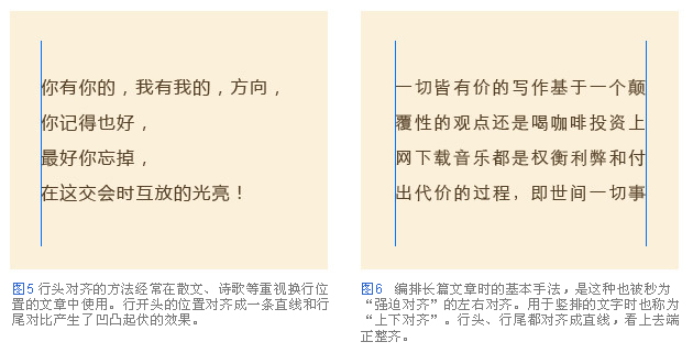 排版中重要的一條,是把應(yīng)該對(duì)齊的部分對(duì)齊,例如每一個(gè)段落的字行對(duì)齊,就是把行的位置進(jìn)行對(duì)齊使其一致的方法。行頭對(duì)齊是所有行均在行頭對(duì)齊的方法(圖5)雖說(shuō)這種用法使得行尾不齊整,但方便文章的停頓部分換行,適用于散文、詩(shī)歌等表現(xiàn)韻味的文字版式。但是,對(duì)于編排長(zhǎng)篇文章時(shí),選擇左右對(duì)齊更能體現(xiàn)條理性。由于換行的位置都相同,閱讀行頭或換行的時(shí)候視線能夠平緩流暢地移動(dòng)。