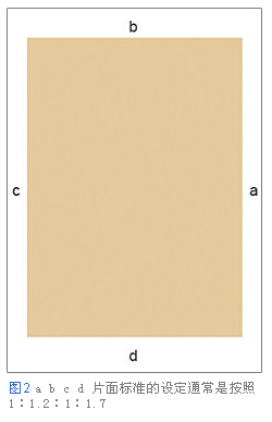 首先在書(shū)籍編排過(guò)程中,設(shè)定頁(yè)面四周的余白來(lái)安排頁(yè)面的排版。頁(yè)邊空白的大小不同,排版效果給讀者帶來(lái)的印象也會(huì)發(fā)生變化,因此需要適當(dāng)?shù)剡M(jìn)行處理。雖然紙質(zhì)書(shū)籍已經(jīng)有了莫里斯所提倡的版面設(shè)定理論,但是這些理論并不適合于顯示在硬件設(shè)備上。因此我們需要根據(jù)不同的媒體特點(diǎn)來(lái)進(jìn)行處理。如圖(2) 有顏色的部分是版面,abcd版面標(biāo)準(zhǔn)的設(shè)定通常是按照1:1.2:1:1.7的比例來(lái)進(jìn)行設(shè)計(jì)。
