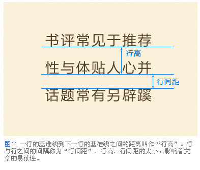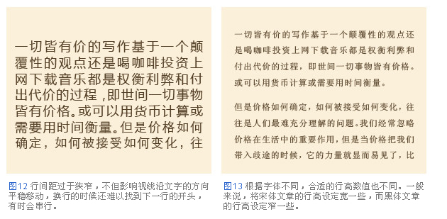 行高,行間距的大小對(duì)文章的易讀性有很大的影響。行與行之間拉得過(guò)開(kāi),從一行末尾移動(dòng)到下一行開(kāi)頭,視線的移動(dòng)距離過(guò)長(zhǎng)增加了閱讀難度。相反,行與行之間貼得過(guò)緊,上下挨得過(guò)緊影響了視線的移動(dòng),讓人不知道正在閱讀哪一行(圖12)。正文最恰當(dāng)?shù)男懈撸緫?yīng)該設(shè)定為其文章中文字大小的兩倍。例如文字大小為8px的文章,就應(yīng)該把行高設(shè)定為16px(圖13)