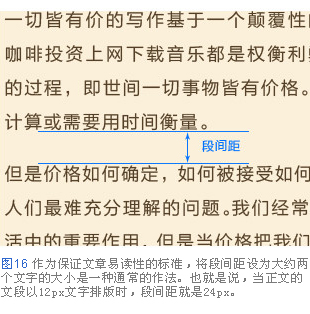 作為保證文章易讀性的標(biāo)準(zhǔn),將段間距設(shè)為大約兩個(gè)文字的大小是一種通常的作法。也就是說(shuō),當(dāng)正文的文段以12p文字排版時(shí),段間距就是24px。當(dāng)然,這個(gè)標(biāo)準(zhǔn)也并不是絕對(duì)的,有時(shí)候也可以通過(guò)刻意地設(shè)定狹窄的段間距,給讀者帶來(lái)內(nèi)容緊湊的印象。