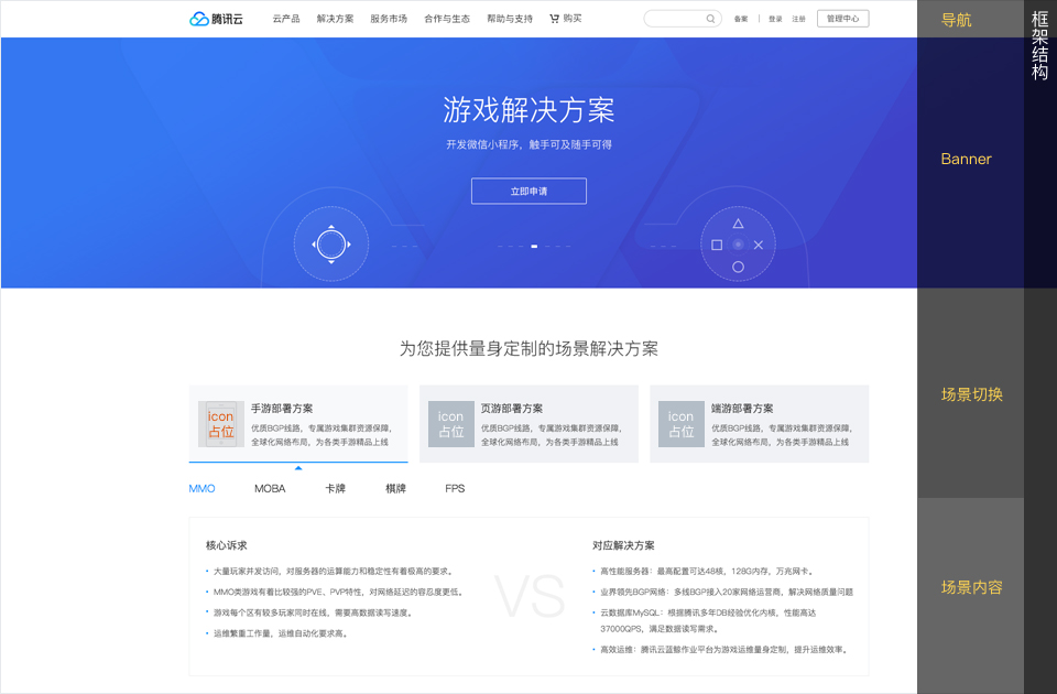 (如下圖所示為常見網(wǎng)頁形態(tài)結(jié)構(gòu),整個頁面UI開發(fā)同學需要得到的其實是設(shè)計師確認的框架結(jié)構(gòu),至于里面的圖標、banner配圖、抑或是文字內(nèi)容都是可以后面提供的。具體來說,如下圖中,場景切換部分為三分陣列版式,灰色方框為圖標占位預留,UI開發(fā)同學只需要圖標占位尺寸即可,圖標細節(jié)和形態(tài),設(shè)計師在后面完成整體頁面框架后-上線前補齊即可。)