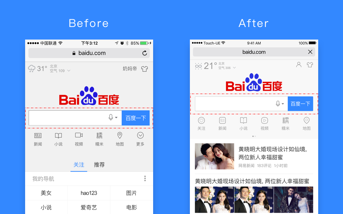 讓搜索干干凈凈,清晰的視覺(jué)風(fēng)格,去掉搜索框的效果修飾, 背景顏色更加清爽。 這是我們百度首頁(yè)UE團(tuán)隊(duì)的工作理念和設(shè)計(jì)觀,這是我們團(tuán)隊(duì)元思考和組織建設(shè)的基礎(chǔ)。經(jīng)過(guò)不斷的磨煉與反思,我們充分認(rèn)識(shí)到了工作理念和設(shè)計(jì)觀對(duì)于一個(gè)團(tuán)隊(duì)的重要性,我們時(shí)刻在提醒自己,要不斷對(duì)已有的經(jīng)驗(yàn)和結(jié)論進(jìn)行反思,要從更多的視角對(duì)它進(jìn)行觀察和思考。只有與時(shí)俱進(jìn),才能生生不息。