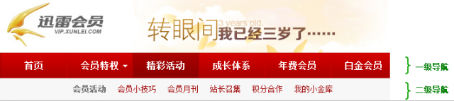 設(shè)計中使用近似的文本、顏色、圖像和留白等,可以更好的區(qū)分各個模塊。如下圖中迅雷會員導(dǎo)航,通過相似原則我們很容易的將一級導(dǎo)航和二級導(dǎo)航區(qū)分開來。