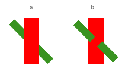 連續(xù)原則 和閉合原則有些類似。以實物形象上的不連續(xù)使瀏覽者產(chǎn)生心理上的連續(xù)知覺??吹絘圖,瀏覽者會認為是一個綠色條和一個紅色相交,而事實卻是b圖。