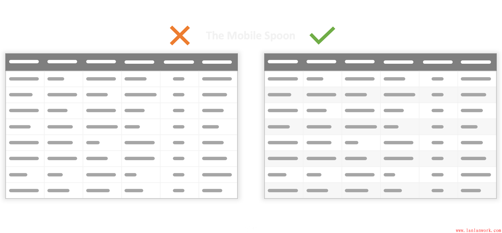 斑馬紋的表格可以幫助用戶保持其位置,但是彩色的行必須非常淺,否則會引起誤導(dǎo),看起來像選定的行。