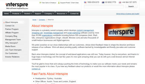 當(dāng)你在設(shè)計中克制而明智地使用色彩時,吸引訪客對重要項目的注意力就變得相當(dāng)容易。在 Interspire 的 “About Us(關(guān)于我們)” 頁面中,訪客的注意力被迅速吸引到頁面頂部LOGO那紅色的一點上,然后是標(biāo)題,然后是頁面右邊的LOGO照片。