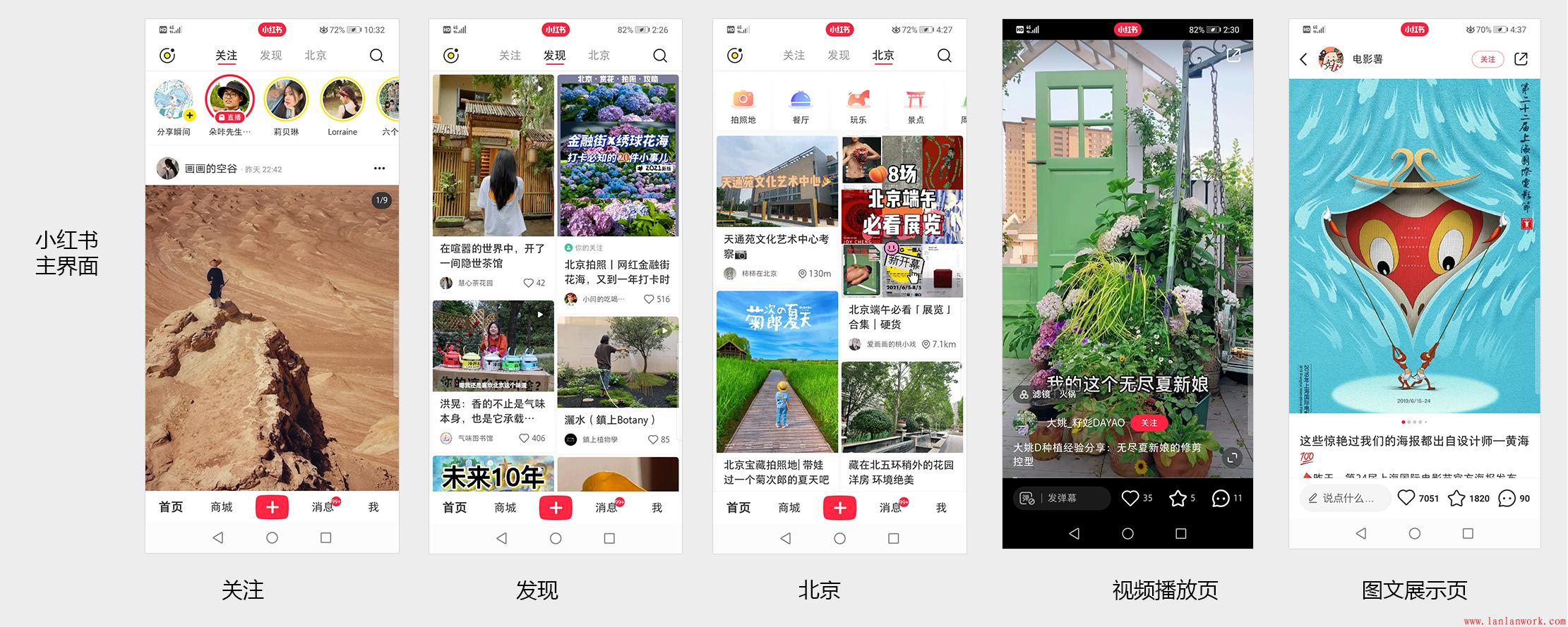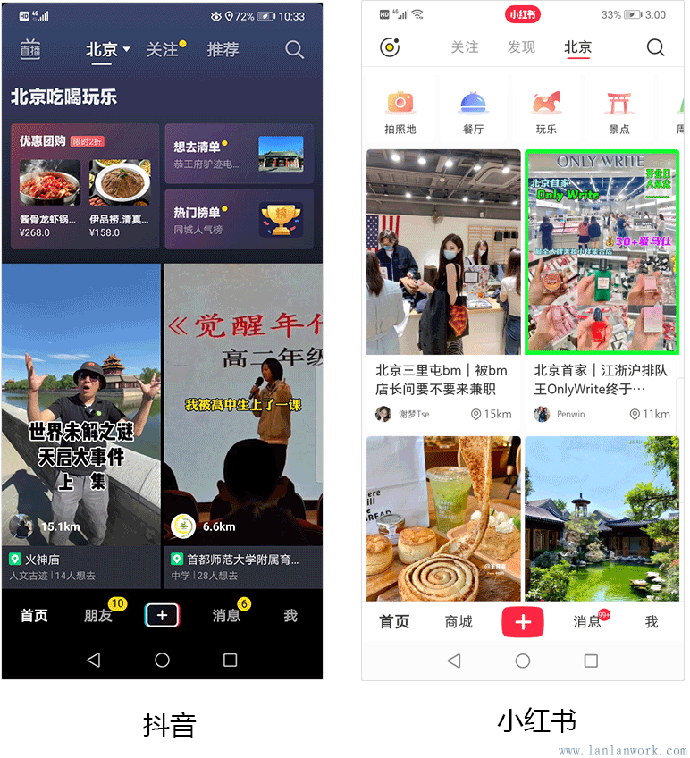 感覺小紅書比什么抖音吸引我(在沒有搜索之前推薦的東西就很吸引我),小紅書里可以學到很多東西,廚藝、書法、服裝搭配、園藝、家居、展訊,推薦的東西基本上是我感興趣的。其實這兩個APP的內(nèi)容本身都是很全的,小紅書在發(fā)現(xiàn)和北京欄目頁面是2行2列,一頁可以展示4個視頻內(nèi)容和標題,節(jié)省了刷屏選擇的時間,相對高效。