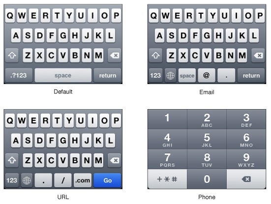 - 智能手機的系統(tǒng)平臺當(dāng)中通常都會內(nèi)置一些針對不同類型內(nèi)容的鍵盤,例如文本、數(shù)字、Email、URL等。在你的應(yīng)用中,確保針對不同的內(nèi)容類型使用對應(yīng)的鍵盤,提升用戶輸入的效率。