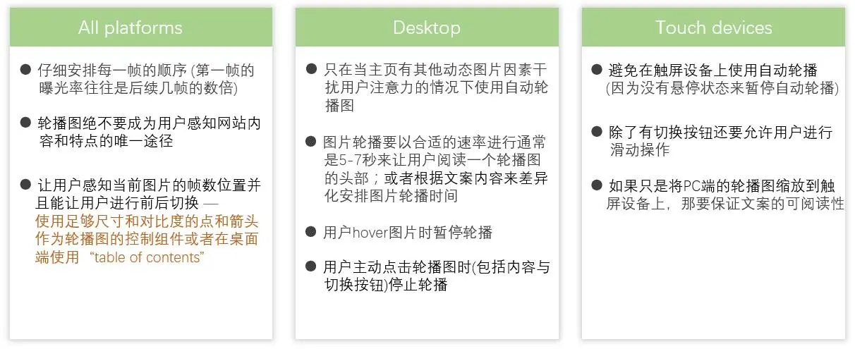 那么,怎樣在實(shí)際運(yùn)用中做好輪播圖設(shè)計(jì)呢,作者將 10 原則分成了四個(gè)部分來進(jìn)行闡述: