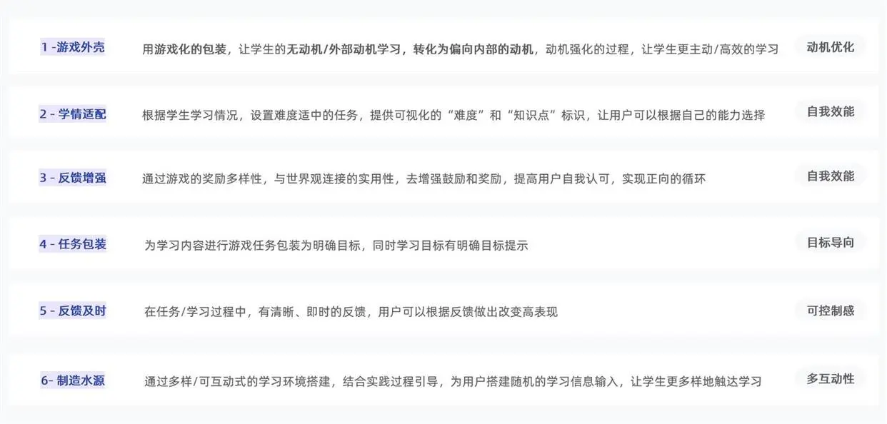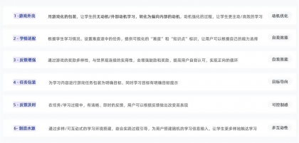 回顧上述內(nèi)容,從教育軟件層面,游戲化設(shè)計(jì)的切入點(diǎn)可以歸納為如下內(nèi)容。