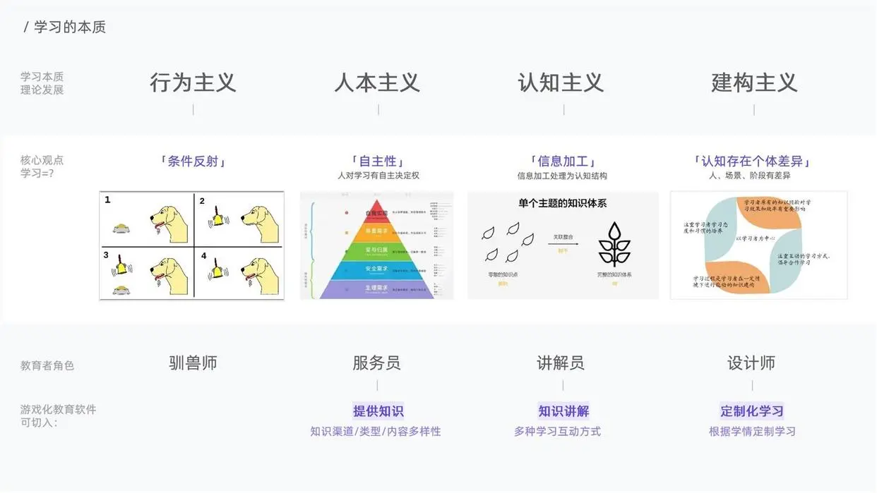 學(xué)習(xí)本質(zhì)的理論基礎(chǔ)經(jīng)過了 4 個(gè)時(shí)期的發(fā)展,從行為主義、人本主義、認(rèn)知主義再到建構(gòu)主義,對(duì)于教育者/方的要求越來越高。