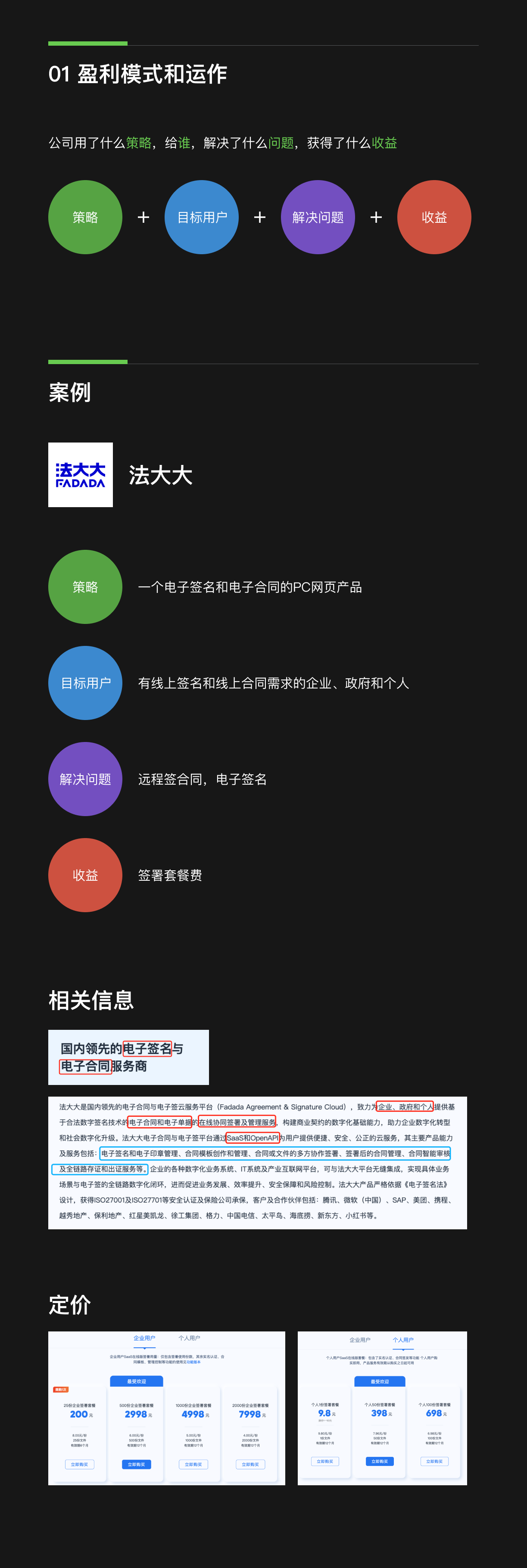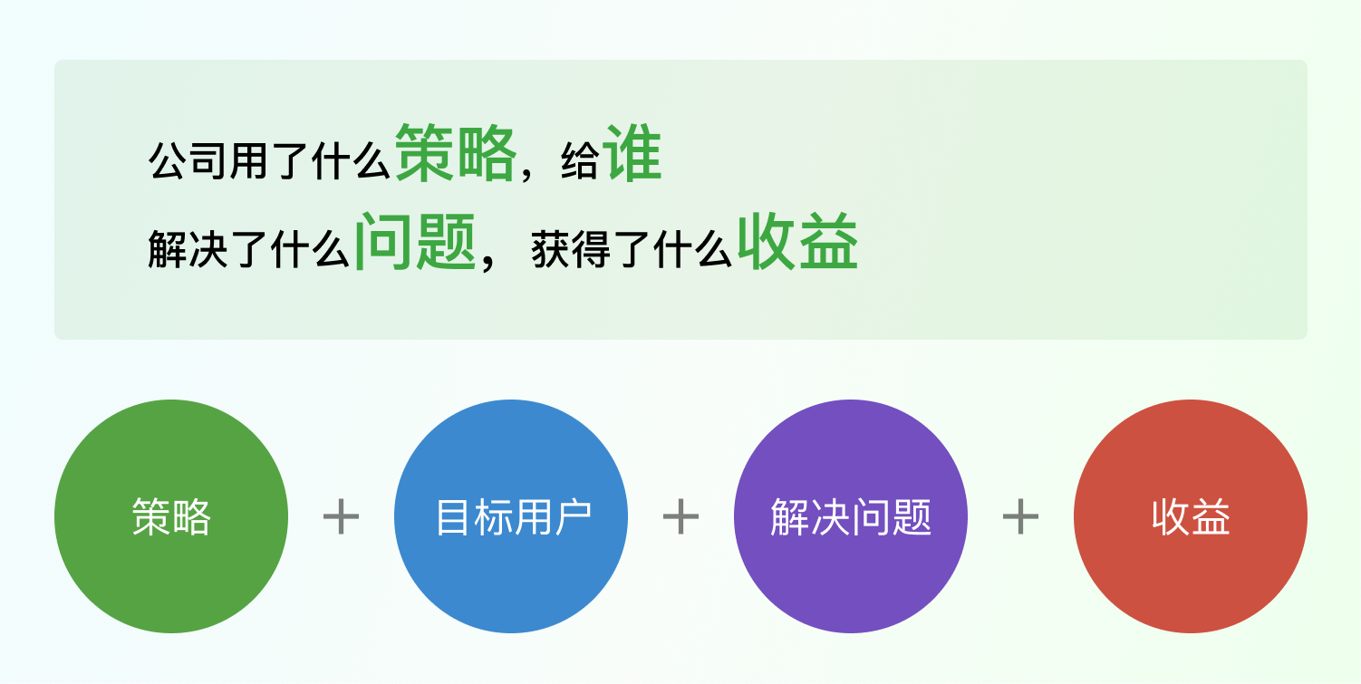 到此先做個(gè)小結(jié):① 了解公司盈利和運(yùn)作的公式:公司用了什么策略,給誰,解決了什么問題,獲得了什么收益
