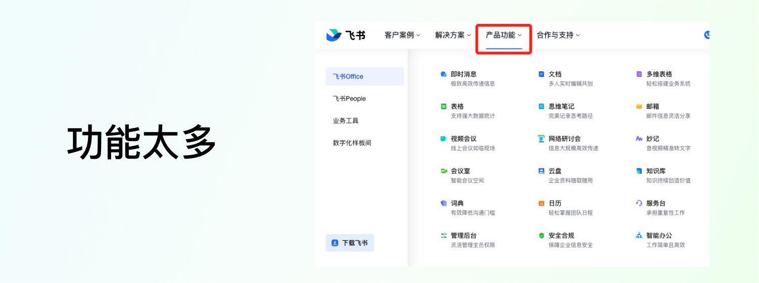 去哪里了解呢?一般企業(yè)官網(wǎng)都會把自家產(chǎn)品列出來,方便客戶查看,咱們也可以順著這條路線去走。就拿飛書舉例,從導(dǎo)航欄的“產(chǎn)品功能”我們可以看到,主要是四條線,咱們不用把每條線都挖得很細(xì)致,但是起碼要有大概的認(rèn)知,知道這是個(gè)什么東西,做什么的,最好上手體驗(yàn)體驗(yàn)。