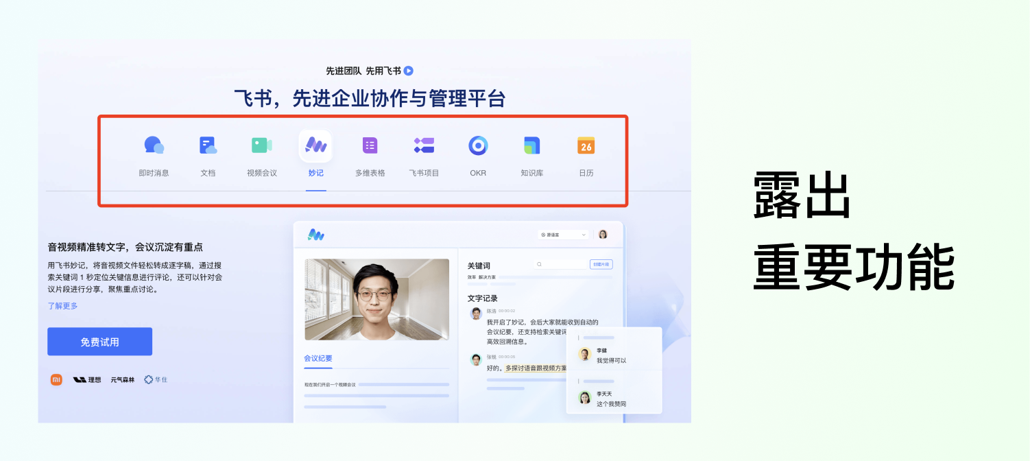例如飛書在未登錄用戶的首頁黃金位置,把重點(diǎn)功能單獨(dú)強(qiáng)調(diào),在登錄用戶的導(dǎo)航欄和頭部的位置都做了這些功能的露出。反復(fù)強(qiáng)調(diào)和露出,重要程度不用我多說了吧。