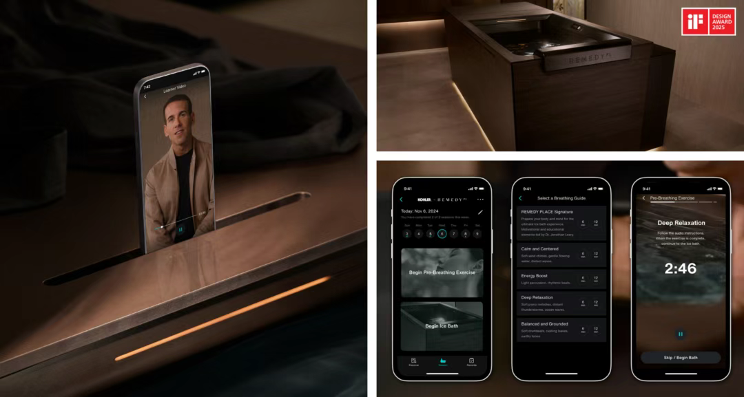 如:這款科勒 x Remedy Place 聯(lián)名冰浴桶將醒目設計、優(yōu)化人機工學和智能科技(Kohler Konnect®)融為一體,提供可定制的冷水浸泡療程,不僅兌現(xiàn)減少炎癥、提升情緒和增強心理韌性的健康承諾,更成為展現(xiàn)優(yōu)雅健康生活的標志性設計。