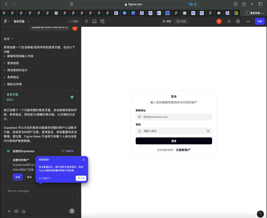 無需編寫 CSS 代碼,輸入指令如“創(chuàng)建帶郵箱/密碼字段的登錄頁”,AI 即刻生成高保真界面及可點擊交互元素。設計構想從概念到屏幕呈現(xiàn)的鏈路被大幅壓縮,省去重復搭建畫布的時間成本。