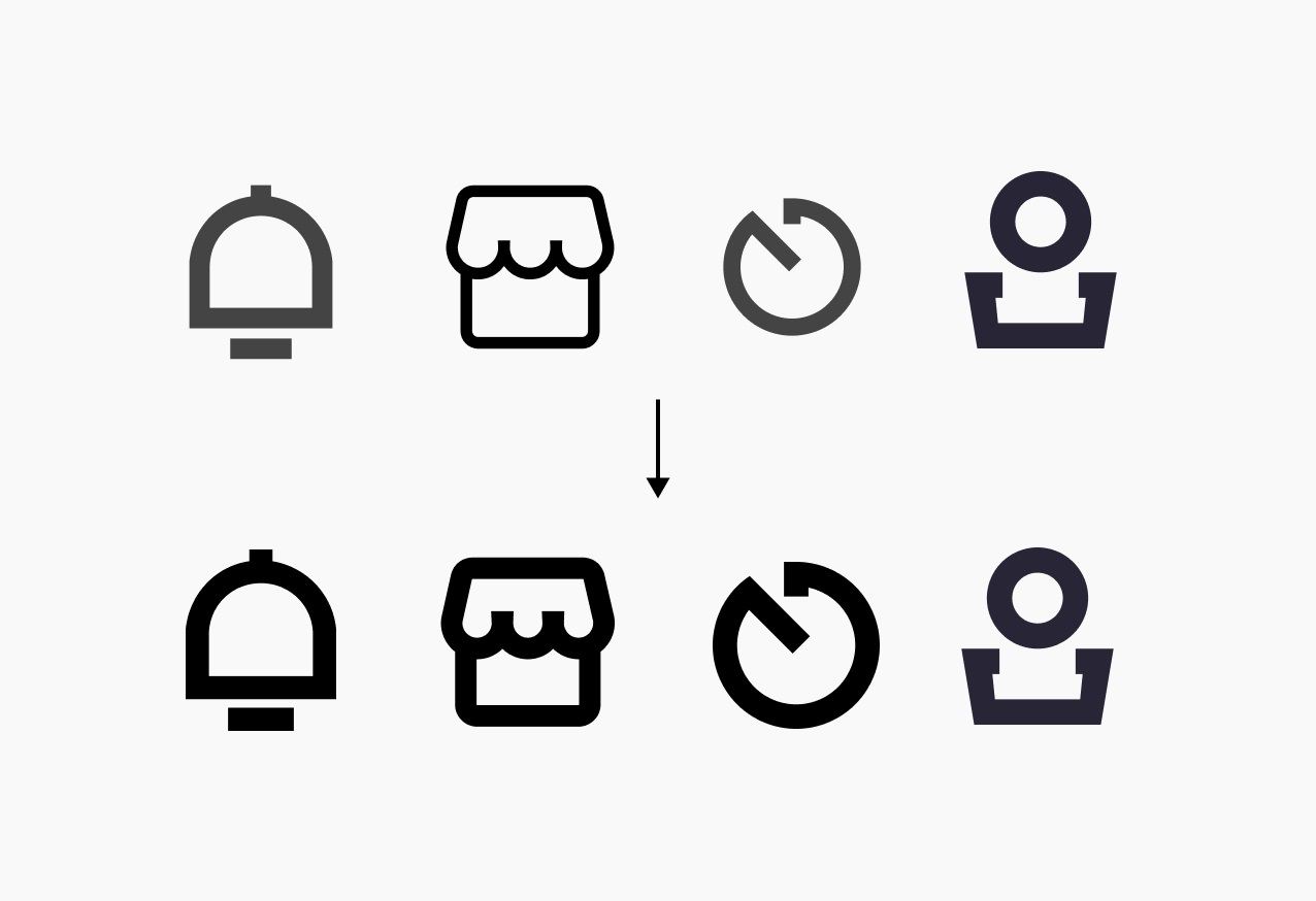 將上一步得到的關(guān)鍵詞轉(zhuǎn)化成抽象圖形,進(jìn)行視覺(jué)化提煉,這時(shí)應(yīng)用圖標(biāo)的雛形已經(jīng)形成,再結(jié)合前面所提到的圖形分類、表現(xiàn)手法以及注意事項(xiàng)等,進(jìn)入圖標(biāo)繪制流程。關(guān)于圖標(biāo)設(shè)計(jì)規(guī)范及原則,在之前的《圖標(biāo)篇 | 圖標(biāo)設(shè)計(jì)必備的基礎(chǔ)知識(shí)!》文章中有詳細(xì)說(shuō)明,這里不做闡述。