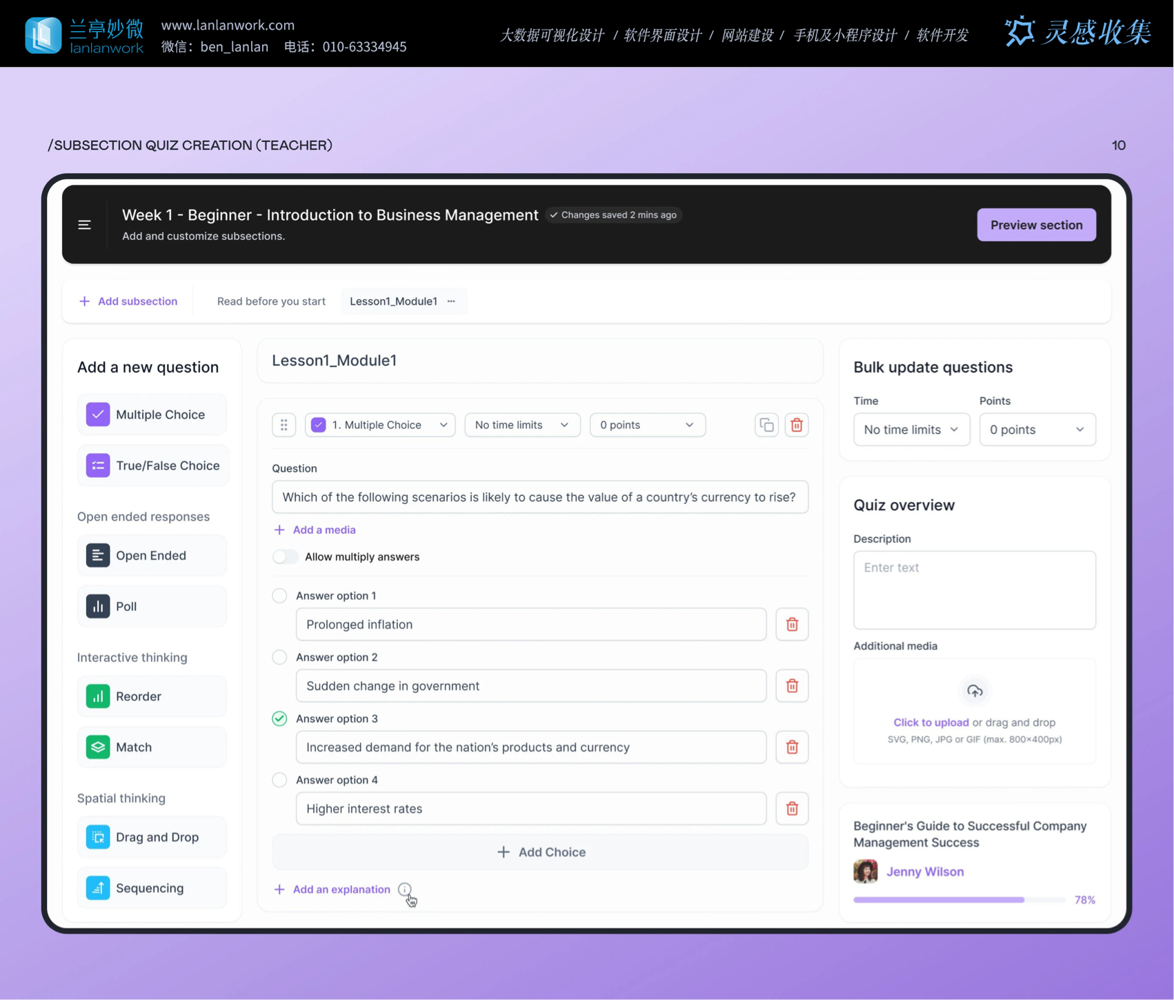 按鈕,操作反饋及時(shí)又明確;老師創(chuàng)建測(cè)驗(yàn)時(shí),能選多種題型,還能添加圖片等媒體、設(shè)置答題時(shí)間和分?jǐn)?shù),滿(mǎn)