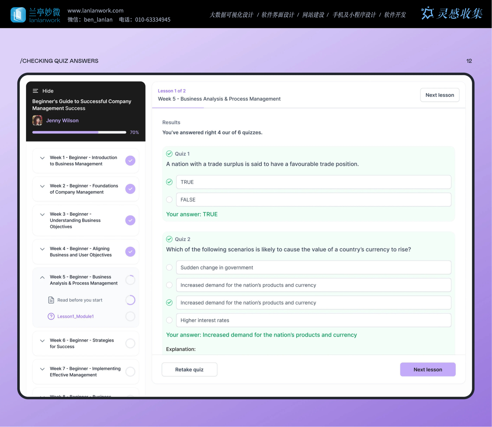 交互設(shè)計(jì)處處為用戶(hù)考慮。就說(shuō)測(cè)驗(yàn)功能,學(xué)生答題頁(yè)有 "Retakeequiz (重新測(cè)驗(yàn))""Next lesson (下一課)"