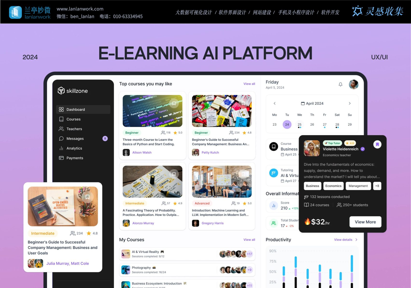 Skillzone 選用柔和的紫色為主色調(diào),紫色常給人智慧、有創(chuàng)造力的的感覺(jué),很符合教育的特點(diǎn)。再搭配簡(jiǎn)潔的黑白