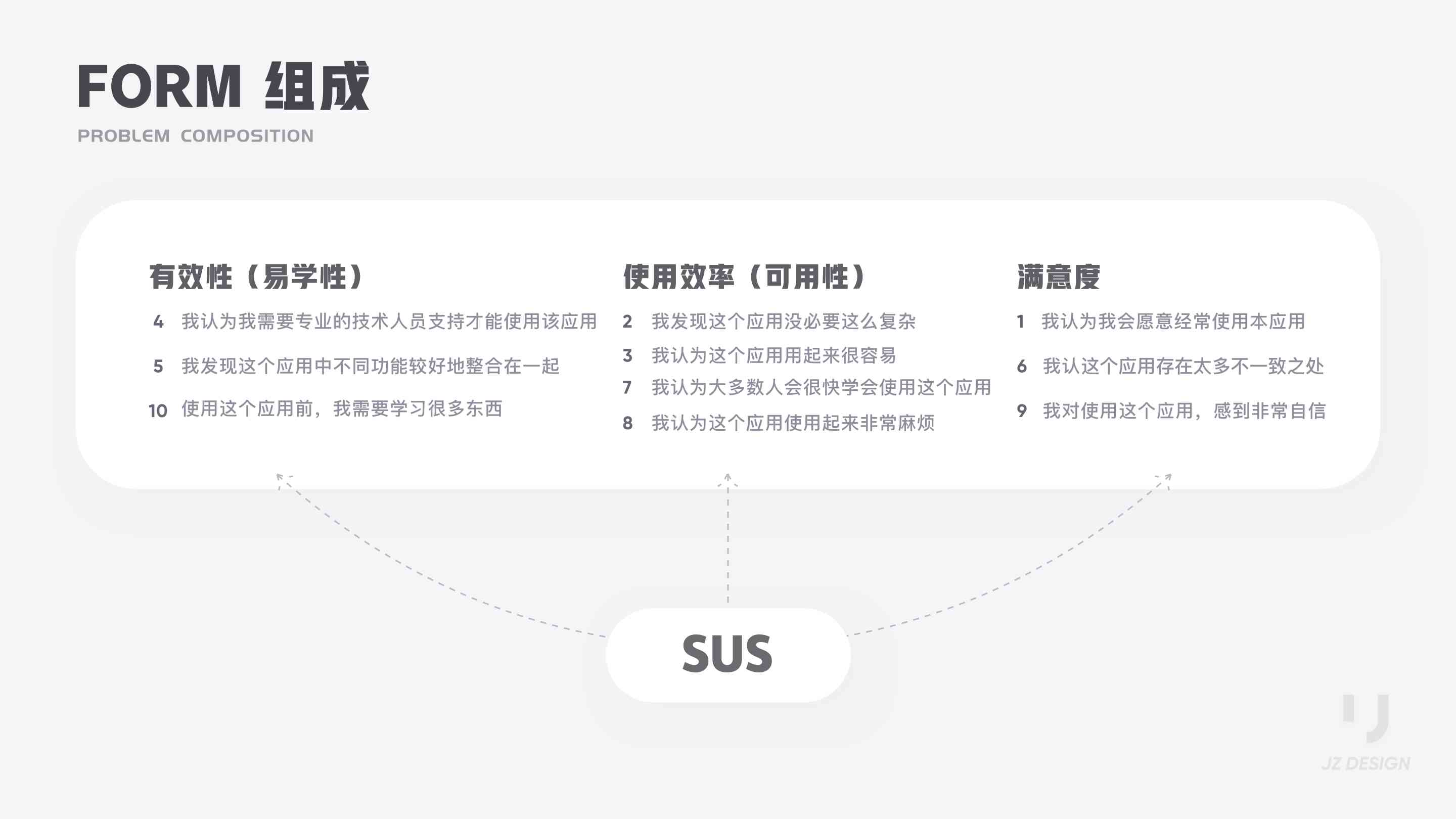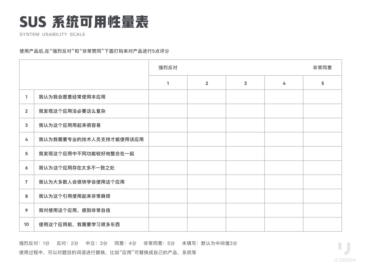 SUS 全稱(chēng) System Usability Scale ,系統(tǒng)可用性量表。SUS最初是Brooke于1986年編制,可以科學(xué)地量化用戶體驗(yàn),用于完成一系列任務(wù)場(chǎng)景后,對(duì)產(chǎn)品或系統(tǒng)整體宏觀的感知可用性測(cè)量。
