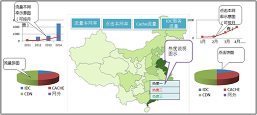 在分省概況模塊里有四個小的模塊。分別是流量本網率、點擊本網率、Cache流量、IDC服務流量。 1、點擊流量本網率——呈現的是全國各省流量本網率的熱力圖。在地圖上點擊某個省份,呈現該省的流量本網率變化趨勢圖和當月的流量流向組成餅圖。點擊具體某一年的流量本網率數據,會詳細呈現當年每月流量本網率的流量流向數據。 2、點擊本網率——呈現的是全國各省點擊本網率的熱力圖。在地圖上點擊某個省份,呈現該省的點擊本網率變化趨勢和當月的點擊流向組成餅圖。 3、Cache流量——呈現的是全國Cache流量的熱力圖。在地圖上點擊某個 省份,呈現該省當月的Cache流量。 4、IDC服務流量——呈現的是全網各省IDC服務流量的熱力圖。在地圖上點擊某個省份,呈現該省當月的IDC服務流量。